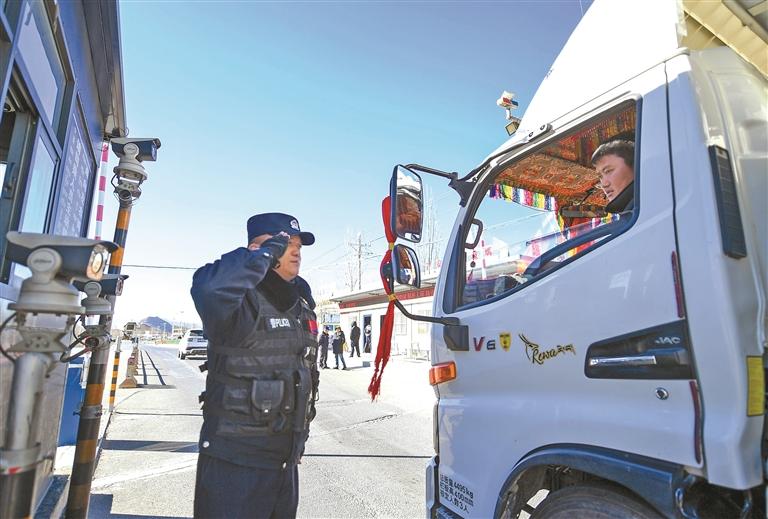“请降下车窗,面对摄像头接受检查。”“开慢点,注意安全。”检查岗亭内,次旦加布一边察看窗外的汽车,一边仔细比对着电脑系统中的信息。