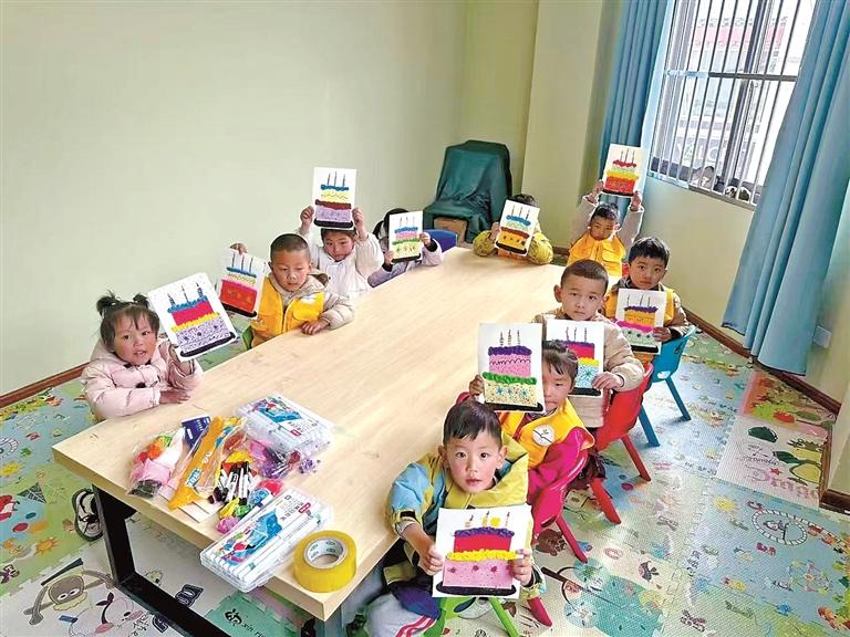 图为寒假期间城关区为辖区双职工家庭提供托管照护服务,孩子们在展示自己的绘画作品。