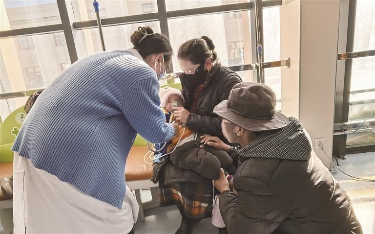 随后,记者又来到自治区第二人民医院儿科输液室,这里同样坐满了正在接受治疗的儿童和陪同的家长,有的孩子蔫头耷脑地靠在家长身上,有的孩子在家长怀里沉沉睡去。在诊室一角,拉萨市民刘先生一边盯着输液的管子,一边轻声安慰着怀里啜泣的孩子。“孩子烧了好几天,吃了药也不见完全好,只能带他来输液,希望这样能快点康复。”刘先生说。