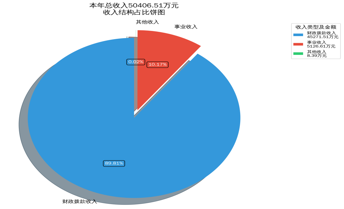 本年收入50,406.51万元。其中:财政拨款收入45271.51 万元,事业收入5126.61万元,其他收入8.39万元,占0.02%。