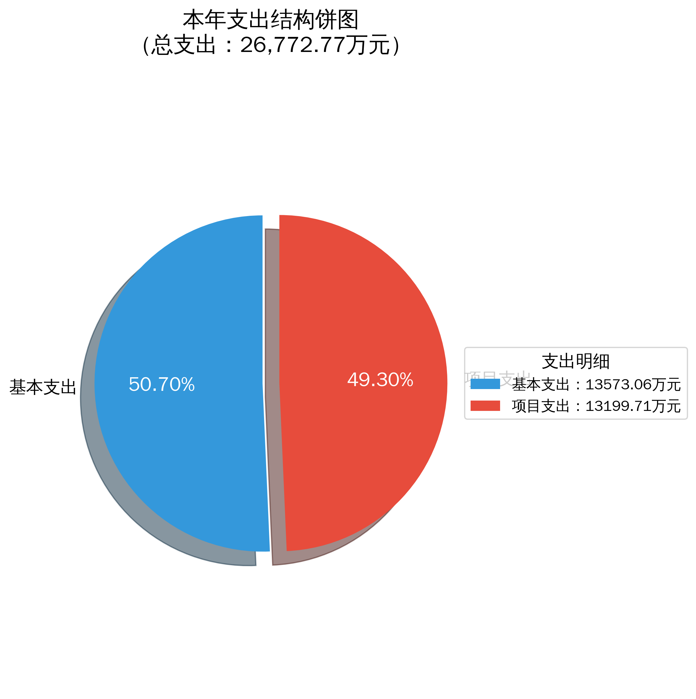 本年支出26,772.77万元,其中:基本支出13,573.06万元,占50.70%;项目支出13,199.71万元,占49.30%。上缴上级支出0.00万元;经营支出0.00万元;对附属单位补助支出0.00万元。